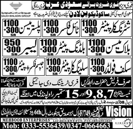 Ceiling Carpenter & Block Mason Jobs 2025 In Saudi Arabia announce the Contract career opportunities for the post of See Below Ad in Saudi Arabia for the fresh and experienced candidates on Contract basis who have Check Advertisement degree. Posted date of this post is 28/08/2025 and the last date is 15/09/2025. if you are eligible for this job apply before due date.