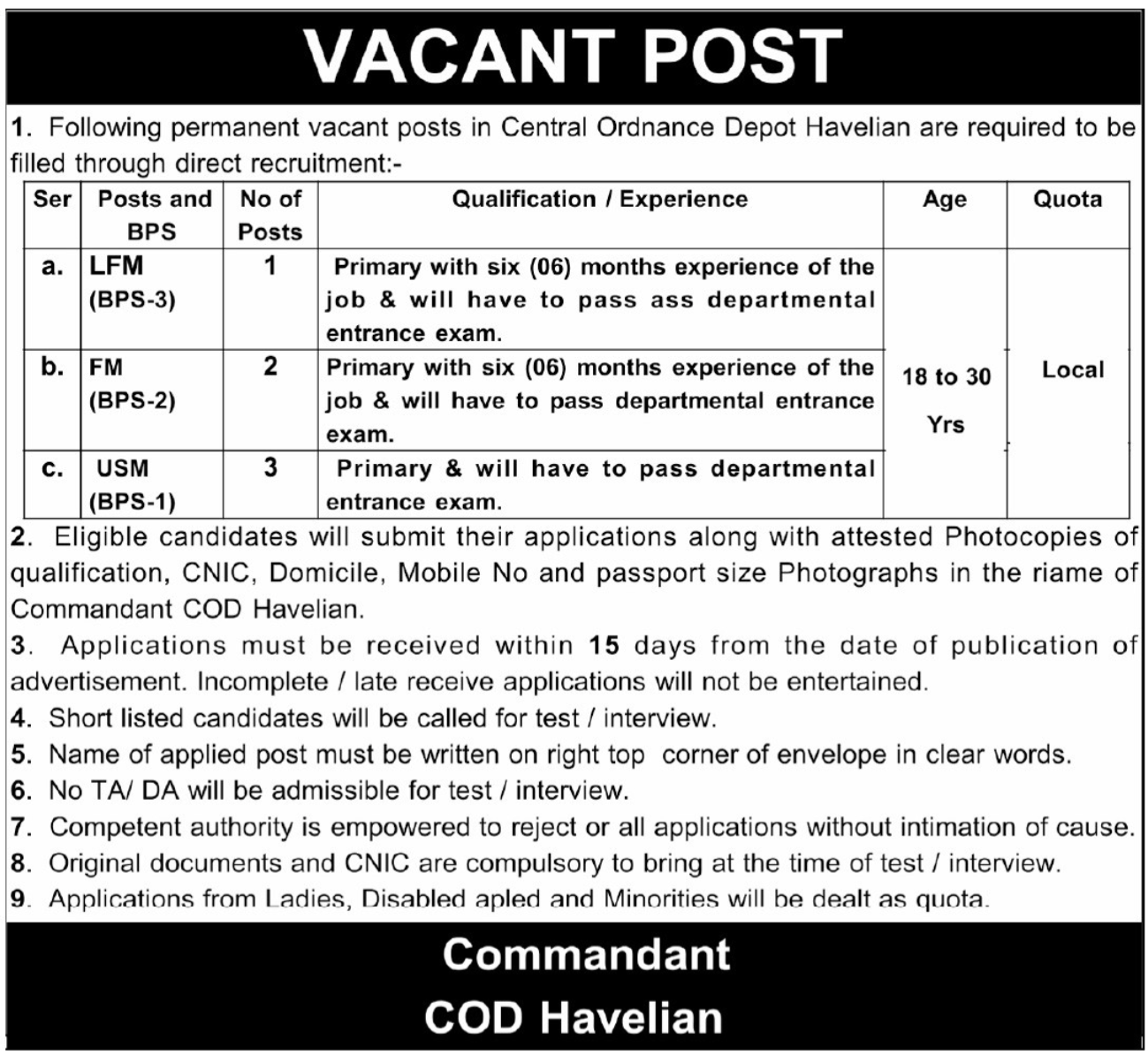Central Ordnance Depot COD Havelian kpk Jobs 2025 announce the Contract career opportunities for the post of See Below Ad in Khyber Pakhtunkhwa for the fresh and experienced candidates on Contract basis who have Check Advertisement degree. Posted date of this post is 23/11/2025 and the last date is 08/12/2025. if you are eligible for this job apply before due date.