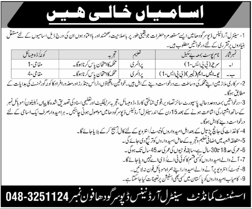 - Applications along with two recent passport size photographs, CNIC, domicile, experience certificates, and attested copies of educational documents, with telephone/mobile number, must reach Central Ordnance Depot Gujranwala within 15 days after the publication of this advertisement. Each candidate is eligible to apply for only one post.