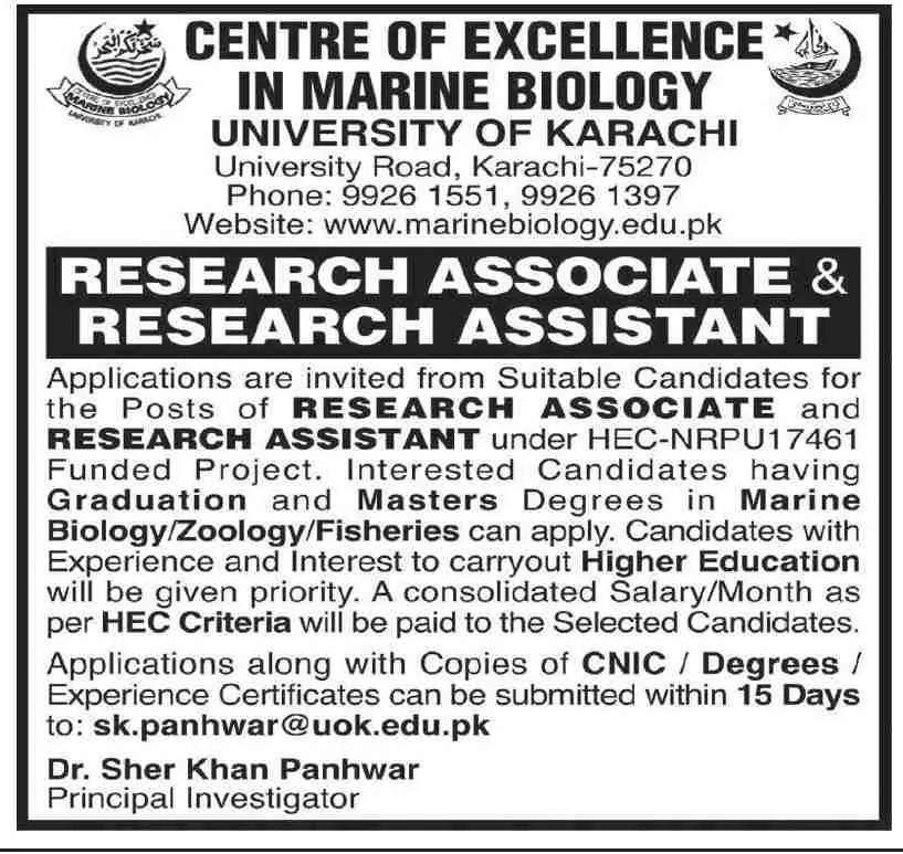 Centre Of Excellence In Marine Biology Karachi Jobs 2023 announce the Contract career opportunities for the post of See Below Ad in Sindh, Karachi for the fresh and experienced candidates on Contract basis who have Check Advertisement degree. Posted date of this post is 03/08/2023 and the last date is 18/08/2023. if you are eligible for this job apply before due date.