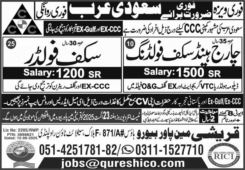 Chargehand Scaffolding & Scaffolder Jobs 2025 announce the Contract career opportunities for the post of See Below Ad in Saudi Arabia for the fresh and experienced candidates on Contract basis who have Check Advertisement degree. Posted date of this post is 20/08/2025 and the last date is 23/08/2025. if you are eligible for this job apply before due date.