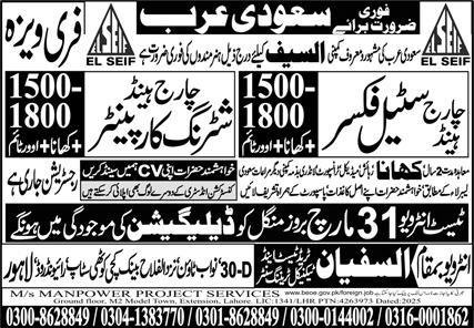 Chargehand Steel Fixer & Chargehand Shuttering Carpenter Job announce the Contract career opportunities for the post of See Below Ad in Saudi Arabia for the fresh and experienced candidates on Contract basis who have Check Advertisement degree. Posted date of this post is 28/03/2026 and the last date is 31/03/2026. if you are eligible for this job apply before due date.