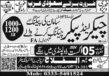 Checker & Packer Jobs 2024 In Saudi Arabia announce the Contract career opportunities for the post of See Below Ad in Saudi Arabia for the fresh and experienced candidates on Contract basis who have Check Advertisement degree. Posted date of this post is 02/08/2024 and the last date is 05/08/2024. if you are eligible for this job apply before due date.