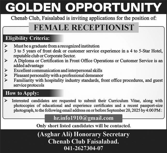 Chenab Club Faisalabad Jobs 2025 For Female Receptionist announce the Contract career opportunities for the post of See Below Ad in Punjab, Faisalabad for the fresh and experienced candidates on Contract basis who have Check Advertisement degree. Posted date of this post is 16/09/2025 and the last date is 19/09/2025. if you are eligible for this job apply before due date.