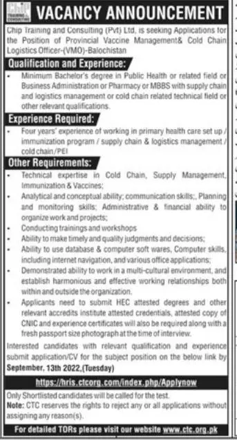 - Vacant posts including logistic officer are announced in CHIP Training & Consulting Pvt Ltd Quetta, quetta Balochistan Pakistan as per 6 September 2022 advertisement in daily Jang Newspaper. Educational qualifications required Master, Bachelor and MS etc.
