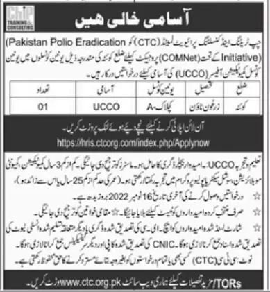 Chip Training & Consulting Pvt Ltd Jobs 2022 announce the Contract career opportunities for the post of See Below Ad in Balochistan, Quetta for the fresh and experienced candidates on Contract basis who have Check Advertisement degree. Posted date of this post is 26/10/2022 and the last date is 16/11/2022. if you are eligible for this job apply before due date.