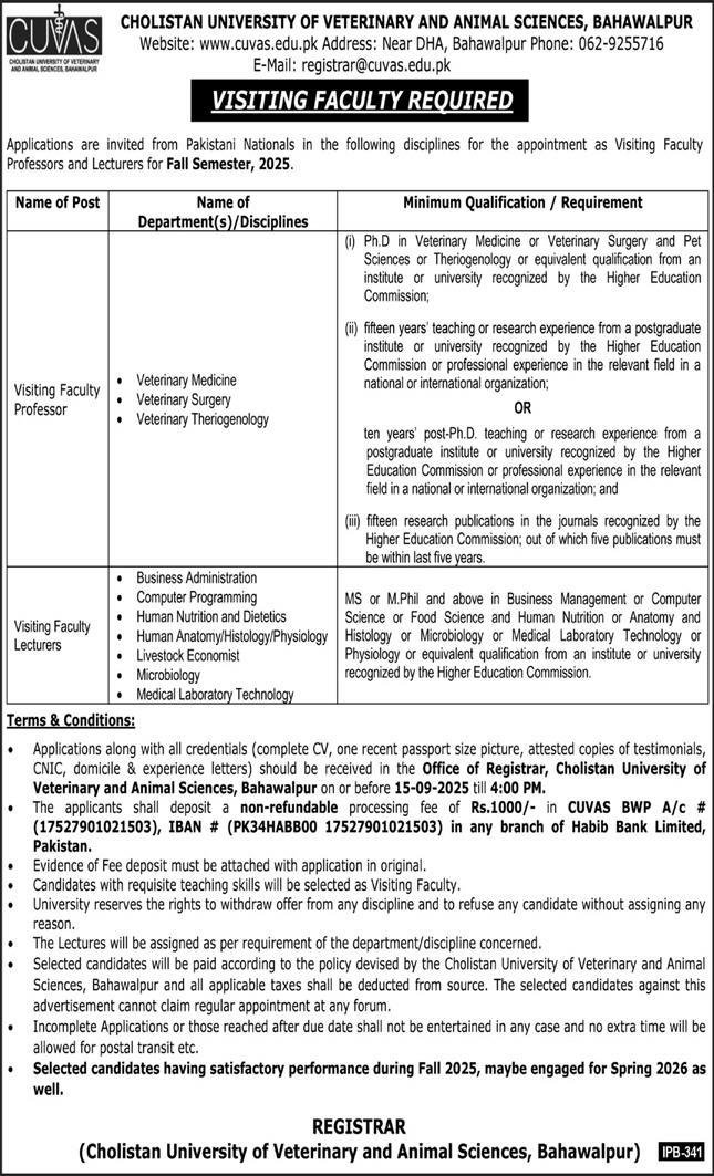 Cholistan University Of Veterinary CUVAS Bahawalpur Jobs announce the Contract career opportunities for the post of See Below Ad in Punjab, Bahawalpur for the fresh and experienced candidates on Contract basis who have Check Advertisement degree. Posted date of this post is 28/08/2025 and the last date is 15/09/2025. if you are eligible for this job apply before due date.