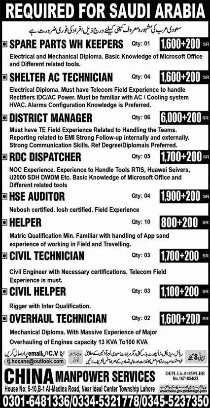 Civil technician and spare parts wh keeper Jobs in Riyadh announce the Contract career opportunities for the post of See Below Ad in Saudi Arabia for the fresh and experienced candidates on Contract basis who have Check Advertisement degree. Posted date of this post is 25/06/2023 and the last date is 11/07/2023. if you are eligible for this job apply before due date.