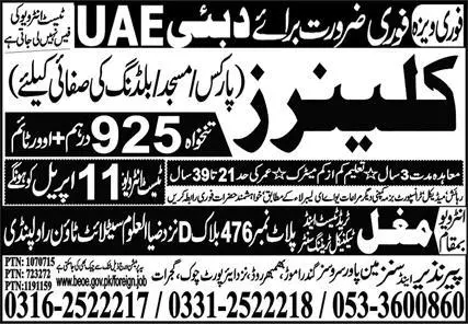 Cleaner Jobs in UAE 2023 announce the Contract career opportunities for the post of See Below Ad in United Arab Emirates for the fresh and experienced candidates on Contract basis who have Check Advertisement degree. Posted date of this post is 08/04/2023 and the last date is 11/04/2023. if you are eligible for this job apply before due date.