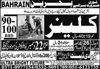 Cleaner Jobs Open In Bahrain 2026 announce the Contract career opportunities for the post of See Below Ad in Bahrain for the fresh and experienced candidates on Contract basis who have Check Advertisement degree. Posted date of this post is 19/12/2025 and the last date is 22/12/2025. if you are eligible for this job apply before due date.
