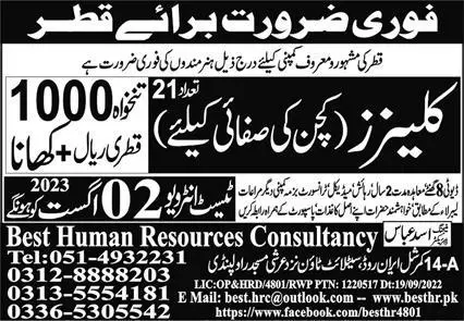 Cleaner Jobs Open In Qatar 2023 announce the Contract career opportunities for the post of See Below Ad in Qatar for the fresh and experienced candidates on Contract basis who have Check Advertisement degree. Posted date of this post is 27/07/2023 and the last date is 02/08/2023. if you are eligible for this job apply before due date.