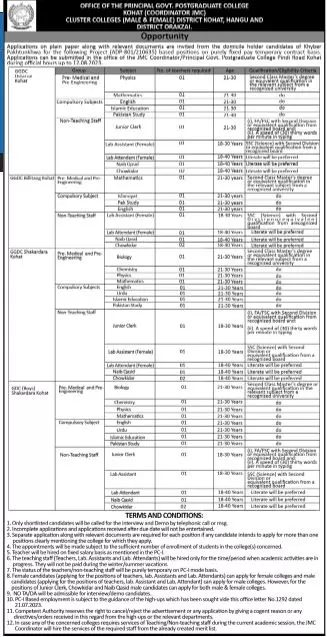 cluster college district kohat Jobs 2023 announce the Contract career opportunities for the post of See Below Ad in Khyber Pakhtunkhwa, Kohat for the fresh and experienced candidates on Contract basis who have Check Advertisement degree. Posted date of this post is 02/08/2023 and the last date is 12/08/2023. if you are eligible for this job apply before due date.