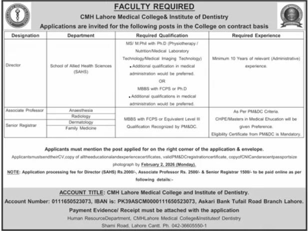 CMH Lahore Medical College & Institute Of Dentistry Jobs announce the Contract career opportunities for the post of See Below Ad in Punjab, Lahore for the fresh and experienced candidates on Contract basis who have Check Advertisement degree. Posted date of this post is 25/01/2026 and the last date is 02/02/2026. if you are eligible for this job apply before due date.