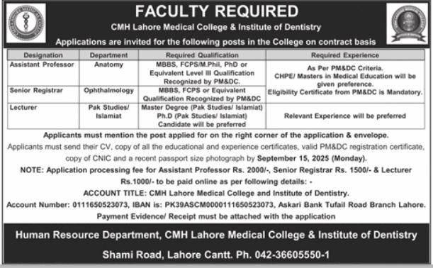 CMH Lahore Medical College Jobs 2025 announce the Contract career opportunities for the post of See Below Ad in Punjab, Lahore for the fresh and experienced candidates on Contract basis who have Check Advertisement degree. Posted date of this post is 10/09/2025 and the last date is 15/09/2025. if you are eligible for this job apply before due date.