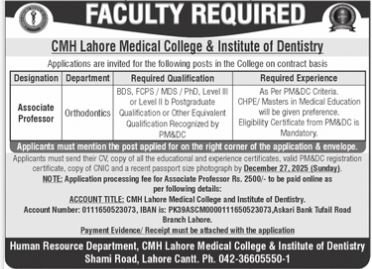 CMH Lahore Medical College Lahore Job 2026 announce the Contract career opportunities for the post of See Below Ad in Punjab, Lahore for the fresh and experienced candidates on Contract basis who have Check Advertisement degree. Posted date of this post is 24/12/2025 and the last date is 27/12/2025. if you are eligible for this job apply before due date.
