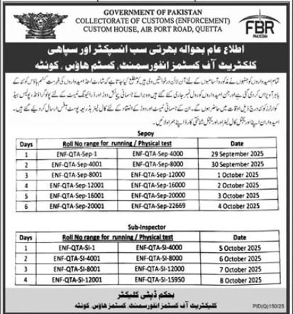 Collectorate of Custom Enforcement Sepoy and Sub Inspector announce the Contract career opportunities for the post of See Below Ad in Balochistan, Quetta for the fresh and experienced candidates on Contract basis who have Check Advertisement degree. Posted date of this post is 26/09/2025 and the last date is 08/10/2025. if you are eligible for this job apply before due date.