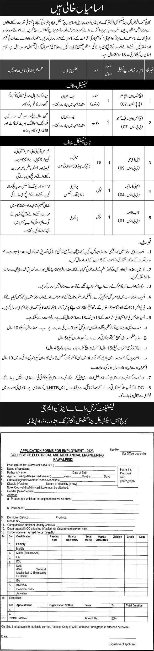 College of Electrical & Mechanical Engineering Jobs 2023 announce the Contract career opportunities for the post of See Below Ad in Punjab, Rawalpindi for the fresh and experienced candidates on Contract basis who have Check Advertisement degree. Posted date of this post is 26/02/2023 and the last date is 13/03/2023. if you are eligible for this job apply before due date.