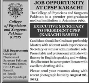 - Vacant posts including executive secretary are announced in College of Physician and Surgeons Pakistan CPSP Karachi, karachi Sindh Pakistan as per 13 August 2023 advertisement in daily Jang Newspaper. Educational qualifications required Master etc.