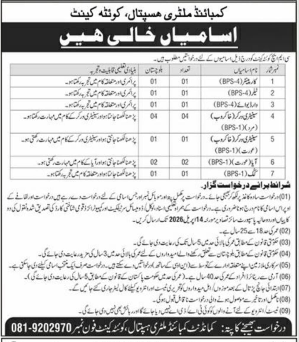 Combined Military Hospital (CMH), Quetta Cantt Jobs 2026 announce the Contract career opportunities for the post of See Below Ad in Balochistan, Quetta for the fresh and experienced candidates on Contract basis who have Check Advertisement degree. Posted date of this post is 01/04/2026 and the last date is 14/04/2026. if you are eligible for this job apply before due date.