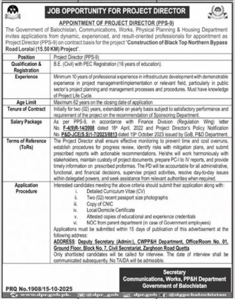 The Government of Balochistan, Communications, Works, Physical Planning & Housing Department invites applications from dynamic, experienced, and result-oriented professionals for appointment as Project Director (PPS-9) on contract basis for the project “Construction of Black Top Northern Bypass Road Loralai (15.50 KM) Project”.