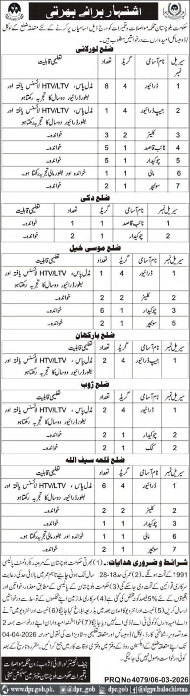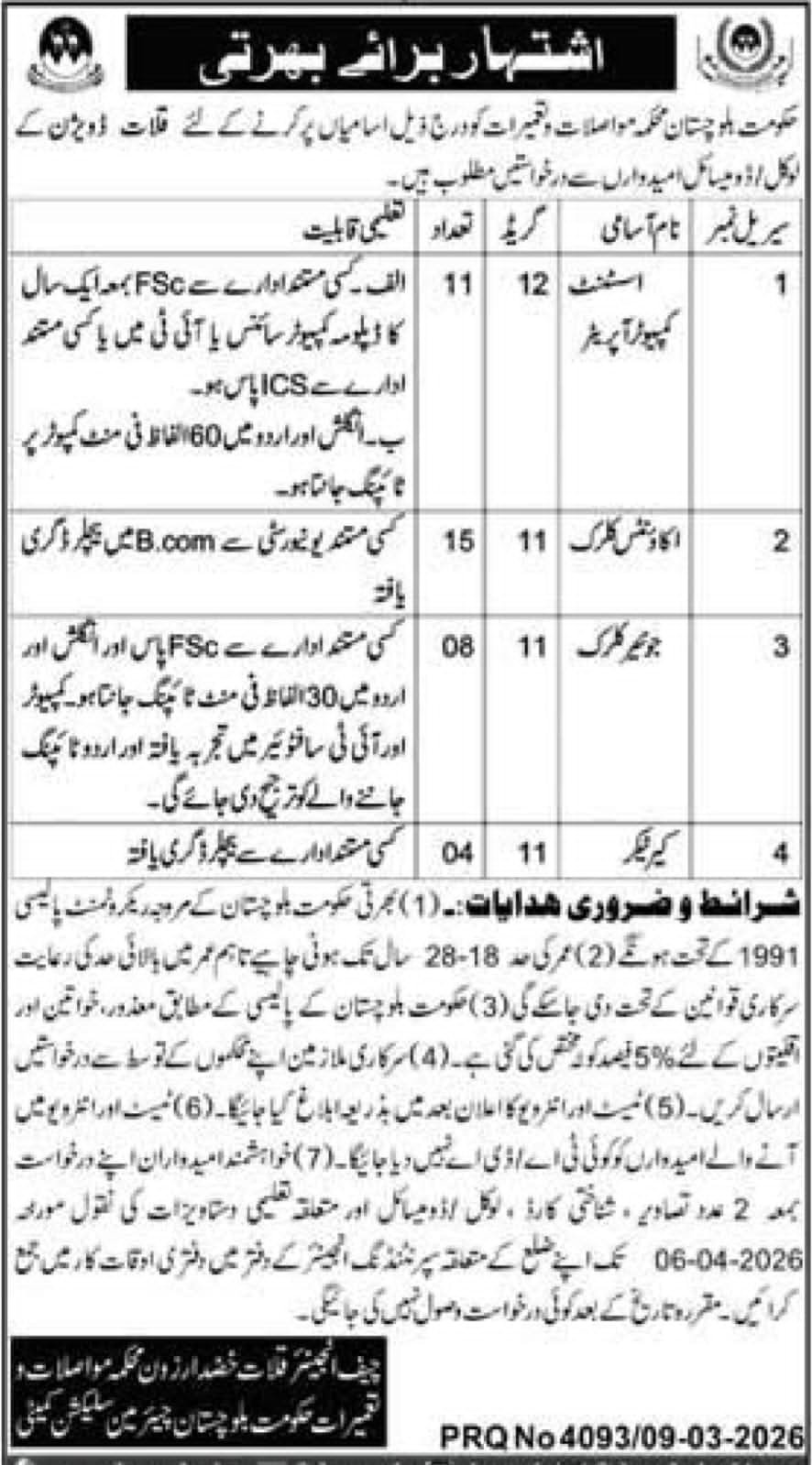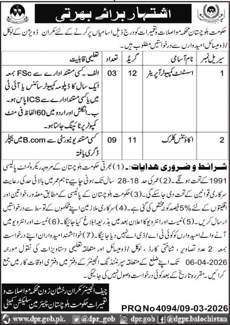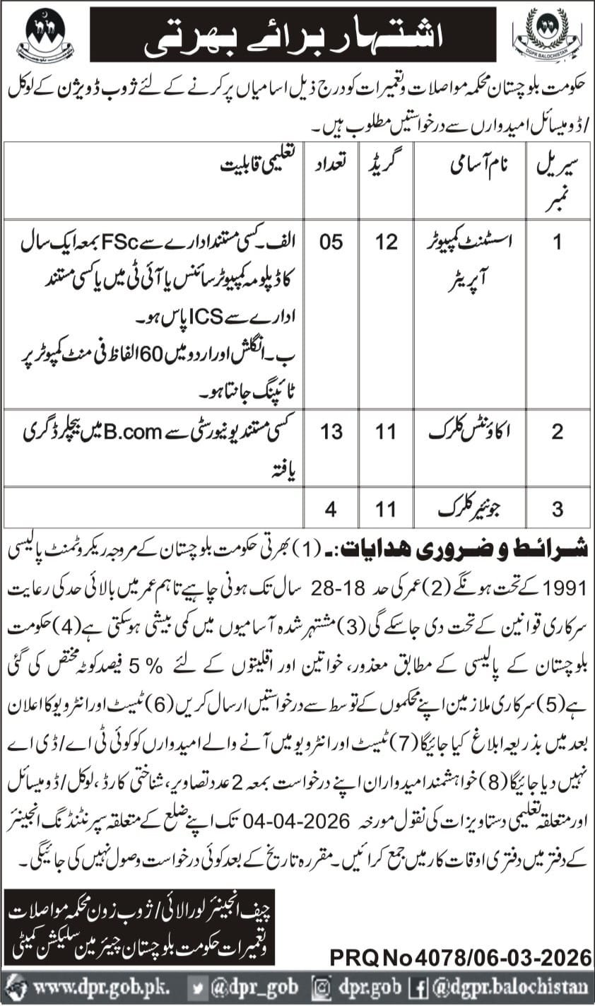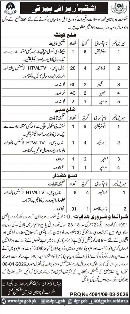 Communication & Works Department Balochistan Jobs 2026 announce the Contract career opportunities for the post of See Below Ad in Balochistan, Quetta for the fresh and experienced candidates on Contract basis who have Check Advertisement degree. Posted date of this post is 10/03/2026 and the last date is 26/03/2026. if you are eligible for this job apply before due date.
