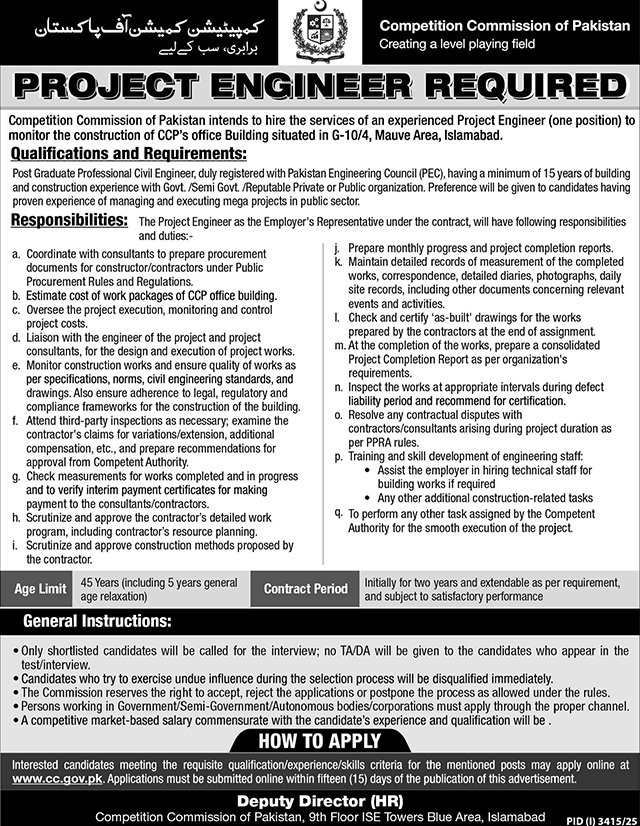 Competition Commission of Pakistan intends to hire the services of an experienced Project Engineer (one position) to monitor the construction of CCP's office Building situated in G-10/4, Mauve Area, Islamabad.