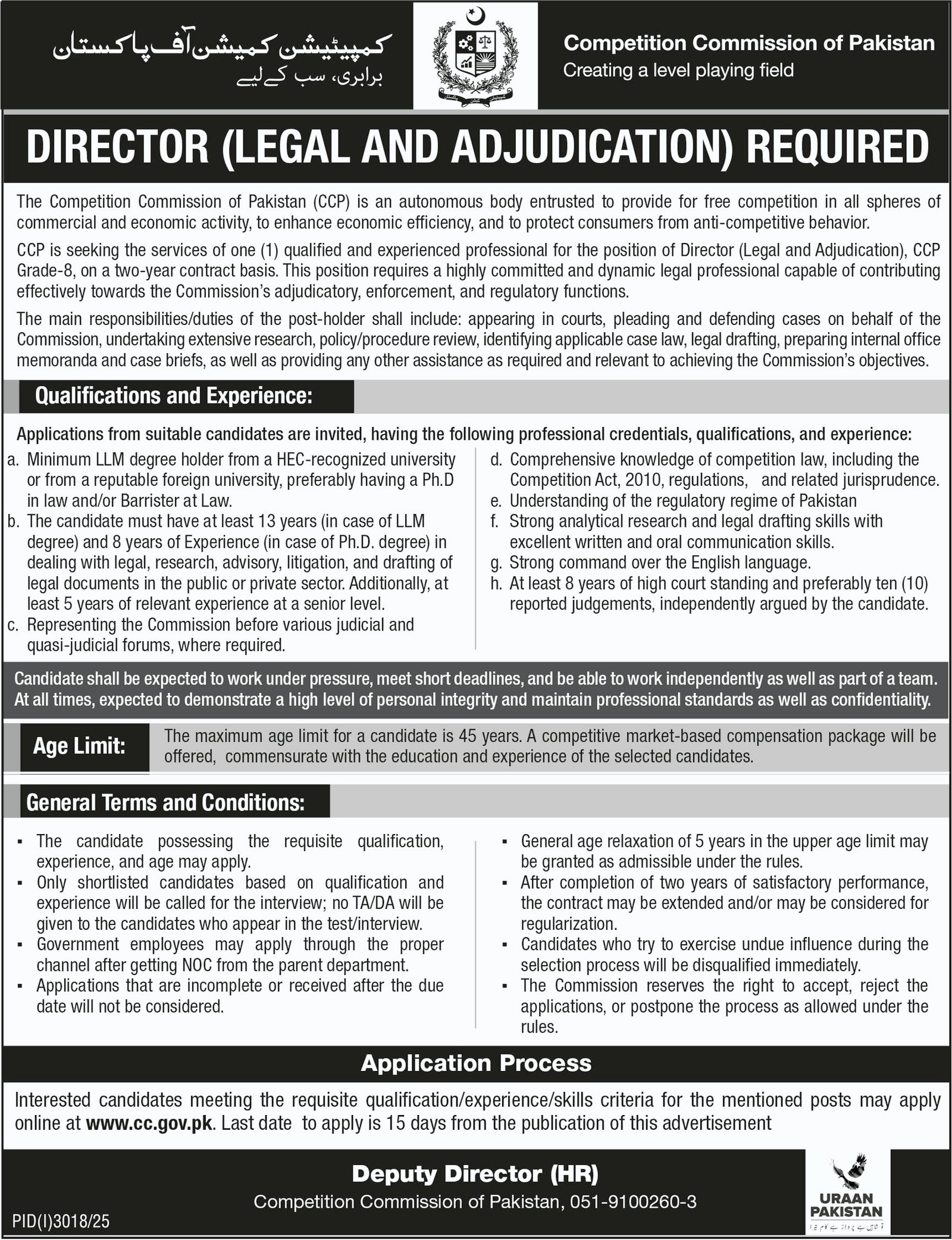 The Competition Commission of Pakistan (CCP) is an independent quasi-regulatory, quasi-judicial body dedicated to foster competition in all spheres of the economy. In alignment with the Commission's requirements, CCP intends to seek the services of qualified individuals with relevant experience for the following positions;