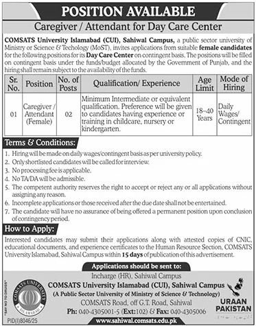 COMSATS University Islamabad (CUI), Sahiwal Campus, a public sector university under the Ministry of Science & Technology (MoST), invites applications from suitable female candidates for the following positions for its Day Care Center on a contingent basis.