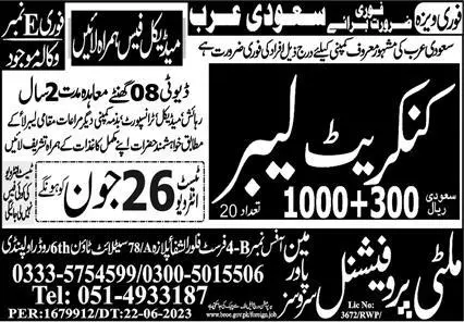 Concrete Labor Jobs Open In Saudi Arabia 2023 announce the Contract career opportunities for the post of See Below Ad in Saudi Arabia for the fresh and experienced candidates on Contract basis who have Check Advertisement degree. Posted date of this post is 24/06/2023 and the last date is 26/06/2023. if you are eligible for this job apply before due date.