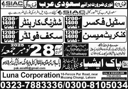 Concrete Mason & Shuttering Carpenter Jobs 2025 announce the Contract career opportunities for the post of See Below Ad in Saudi Arabia for the fresh and experienced candidates on Contract basis who have Check Advertisement degree. Posted date of this post is 26/11/2025 and the last date is 28/11/2025. if you are eligible for this job apply before due date.