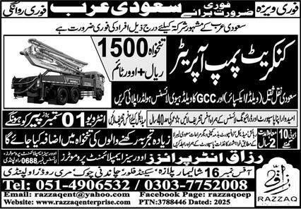 Concrete Pump Operator Jobs Open In Saudi Arabia 2025 announce the Contract career opportunities for the post of See Below Ad in Saudi Arabia for the fresh and experienced candidates on Contract basis who have Check Advertisement degree. Posted date of this post is 28/08/2025 and the last date is 01/09/2025. if you are eligible for this job apply before due date.