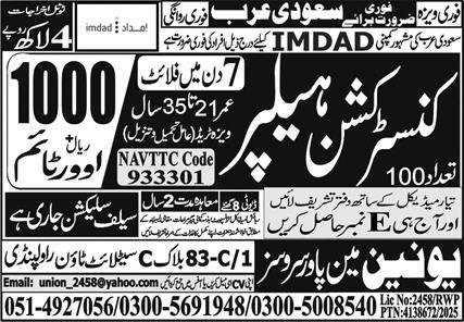 Construction Helper Jobs 2026 In Saudi Arabia announce the Contract career opportunities for the post of See Below Ad in Saudi Arabia for the fresh and experienced candidates on Contract basis who have Check Advertisement degree. Posted date of this post is 10/01/2026 and the last date is 17/01/2026. if you are eligible for this job apply before due date.