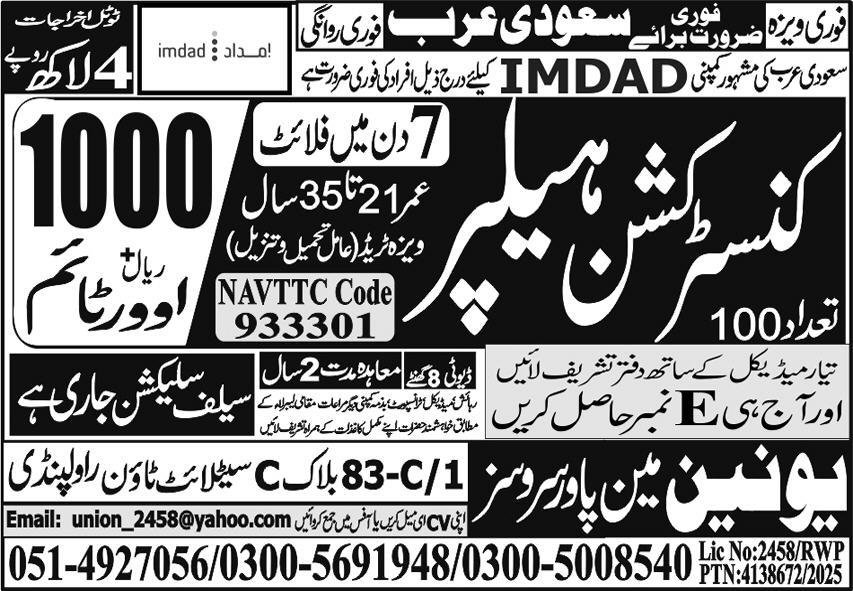 Construction Helper Jobs in Saudia Arabia 2026 announce the Contract career opportunities for the post of See Below Ad in Saudi Arabia for the fresh and experienced candidates on Contract basis who have Check Advertisement degree. Posted date of this post is 01/01/2026 and the last date is 15/01/2026. if you are eligible for this job apply before due date.