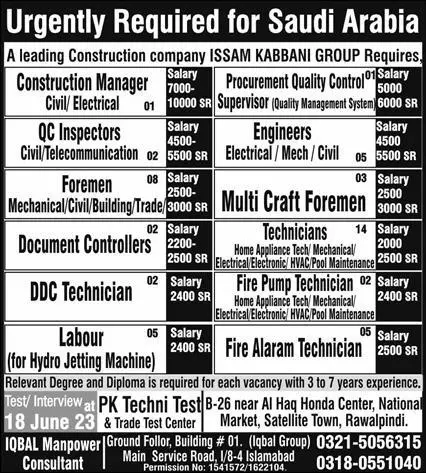 Construction Manager And Engineer Jobs In Saudi Arabia 2023 announce the Contract career opportunities for the post of See Below Ad in Saudi Arabia for the fresh and experienced candidates on Contract basis who have Check Advertisement degree. Posted date of this post is 15/06/2023 and the last date is 18/06/2023. if you are eligible for this job apply before due date.
