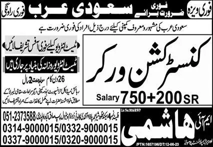 Construction Worker Jobs 2023 In Saudi Arabia announce the Contract career opportunities for the post of See Below Ad in Saudi Arabia for the fresh and experienced candidates on Contract basis who have Check Advertisement degree. Posted date of this post is 26/07/2023 and the last date is 02/08/2023. if you are eligible for this job apply before due date.