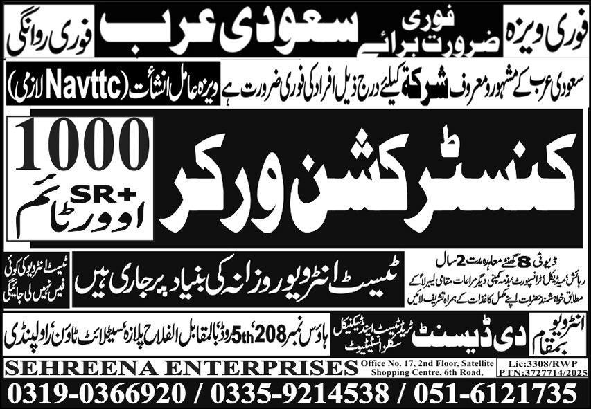 Construction Worker Jobs In Saudi Arabia 2025 announce the Contract career opportunities for the post of See Below Ad in Saudi Arabia for the fresh and experienced candidates on Contract basis who have Check Advertisement degree. Posted date of this post is 28/09/2025 and the last date is 05/10/2025. if you are eligible for this job apply before due date.