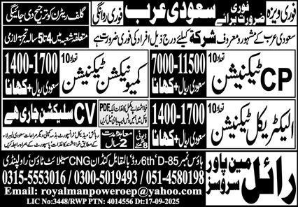 CP Technician & Communication Technician Jobs 2025 announce the Contract career opportunities for the post of See Below Ad in Saudi Arabia for the fresh and experienced candidates on Contract basis who have Check Advertisement degree. Posted date of this post is 19/09/2025 and the last date is 26/09/2025. if you are eligible for this job apply before due date.