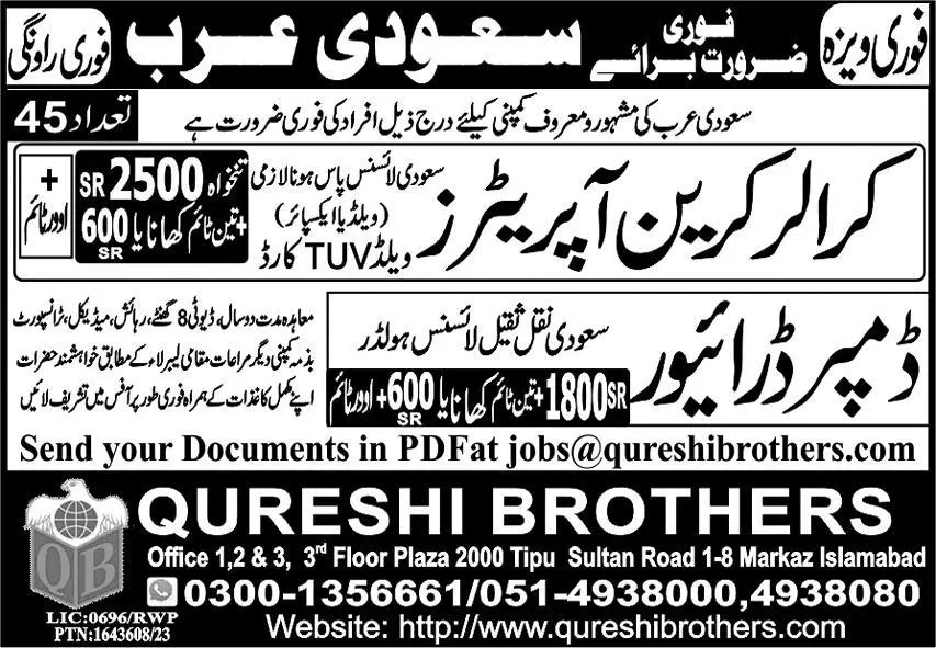 Crawler Crane Operator & Dumper Driver Jobs 2023 announce the Contract career opportunities for the post of See Below Ad in Saudi Arabia for the fresh and experienced candidates on Contract basis who have Check Advertisement degree. Posted date of this post is 31/08/2023 and the last date is 07/09/2023. if you are eligible for this job apply before due date.