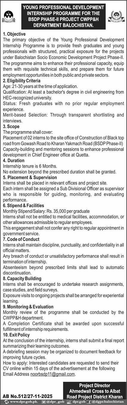 CWPP&H Department Balochistan Internship Programme 2025 announce the Contract career opportunities for the post of See Below Ad in Balochistan, Kharan for the fresh and experienced candidates on Contract basis who have Check Advertisement degree. Posted date of this post is 28/11/2025 and the last date is 13/12/2025. if you are eligible for this job apply before due date.