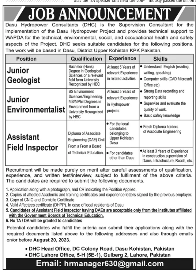 Dasu Hydropower Consultants DHC Lahore Jobs 2023 announce the Contract career opportunities for the post of See Below Ad in Punjab, Lahore for the fresh and experienced candidates on Contract basis who have Check Advertisement degree. Posted date of this post is 12/08/2023 and the last date is 20/08/2023. if you are eligible for this job apply before due date.