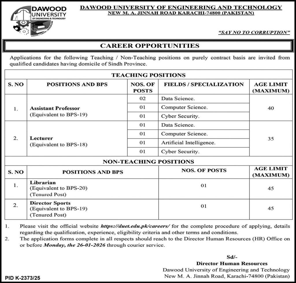Dawood University Of Engineering & Technology DUET Jobs 2026 announce the Contract career opportunities for the post of See Below Ad in Sindh, Karachi for the fresh and experienced candidates on Contract basis who have Check Advertisement degree. Posted date of this post is 13/01/2026 and the last date is 26/01/2026. if you are eligible for this job apply before due date.
