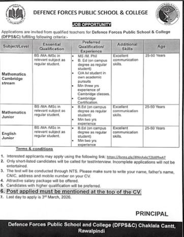 Defence Forces Public School & College (DFPS&C) Jobs 2026 announce the Contract career opportunities for the post of See Below Ad in Punjab, Rawalpindi for the fresh and experienced candidates on Contract basis who have Check Advertisement degree. Posted date of this post is 23/02/2026 and the last date is 03/03/2026. if you are eligible for this job apply before due date.