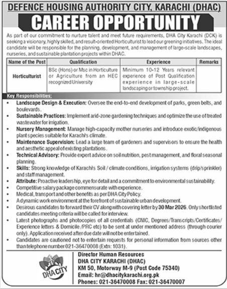 Defence Housing Authority City DHAC Karachi Jobs 2026 announce the Contract career opportunities for the post of See Below Ad in Sindh, Karachi for the fresh and experienced candidates on Contract basis who have Check Advertisement degree. Posted date of this post is 20/03/2026 and the last date is 30/03/2026. if you are eligible for this job apply before due date.