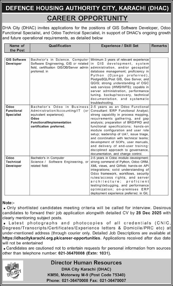 Defence Housing Authority DHA Jobs 2026 announce the Contract career opportunities for the post of See Below Ad in Sindh, Karachi for the fresh and experienced candidates on Contract basis who have Check Advertisement degree. Posted date of this post is 23/12/2025 and the last date is 07/01/2026. if you are eligible for this job apply before due date.