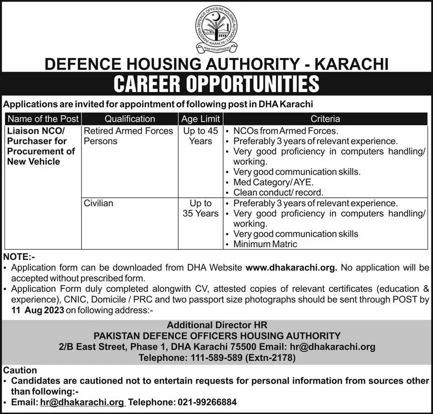 - 11 Aug 2023 on following address:-Additional Director HR PAKISTAN DEFENCE OFFICERS HOUSING AUTHORITY