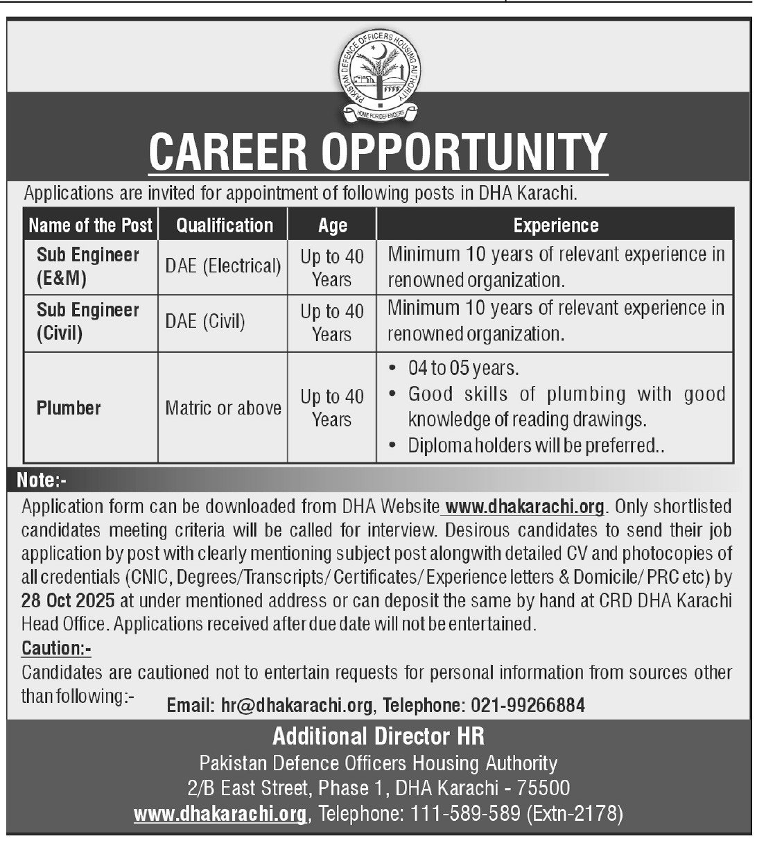 Application form can be downloaded from DHA Website . Only shortlisted candidates meeting criteria will be called for interview. Desirous candidates to send their job application by post with clearly mentioning subject post alongwith detailed CV and photocopies of all credentials (CNIC, Degrees/Transcripts/Certificates/Experience letters & Domicile/PRC etc) by 28 Oct 2025 at under mentioned address or can deposit the same by hand at CRD DHA Karachi Head Office. Applications received after due date will not be entertained.