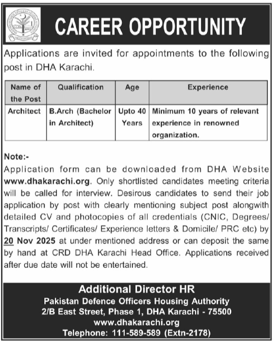 Defence Housing Authority DHA Karachi Jobs 2025 announce the Contract career opportunities for the post of See Below Ad in Sindh, Karachi for the fresh and experienced candidates on Contract basis who have Check Advertisement degree. Posted date of this post is 12/11/2025 and the last date is 20/11/2025. if you are eligible for this job apply before due date.