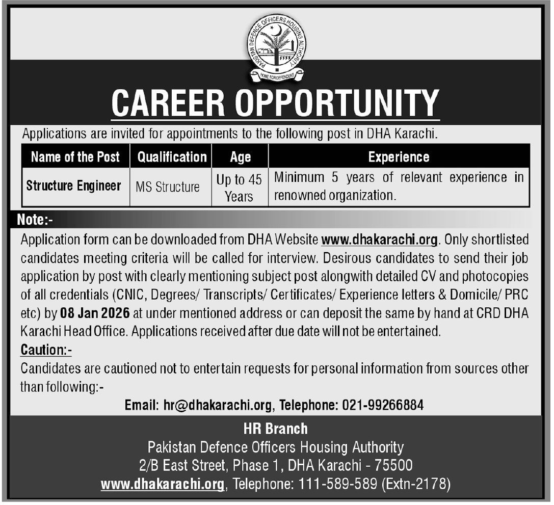 Application form can be downloaded from DHA Website www.dhakarachi.org. Only shortlisted candidates meeting criteria will be called for interview. Desirous candidates to send their job application by post with clearly mentioning subject post alongwith detailed CV and photocopies of all credentials (CNIC, Degrees/ Transcripts/ Certificates/ Experience letters & Domicile/ PRC etc) by 08 Jan 2026 at under mentioned address or can deposit the same by hand at CRD DHA Karachi Head Office. Applications received after due date will not be entertained.