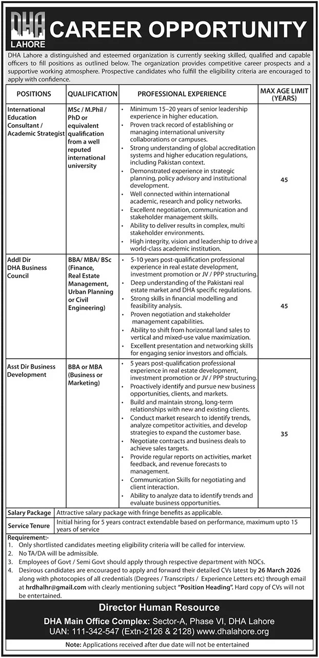 Defence Housing Authority DHA Lahore Jobs 2026 announce the Contract career opportunities for the post of See Below Ad in Punjab, Lahore for the fresh and experienced candidates on Contract basis who have Check Advertisement degree. Posted date of this post is 25/03/2026 and the last date is 26/03/2026. if you are eligible for this job apply before due date.