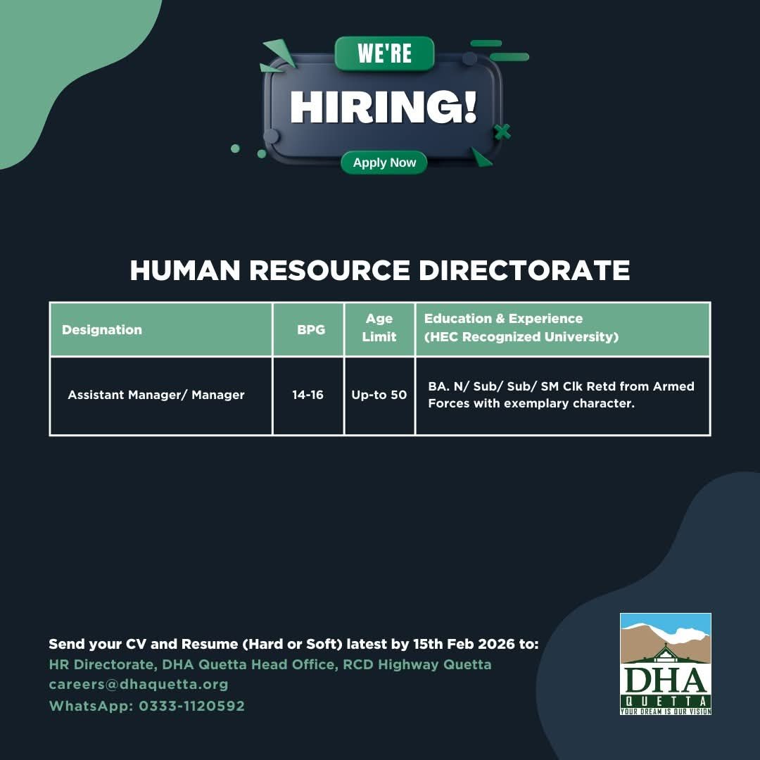 Defence Housing Authority DHA Quetta Jobs 2026 announce the Contract career opportunities for the post of See Below Ad in Balochistan, Quetta for the fresh and experienced candidates on Contract basis who have Check Advertisement degree. Posted date of this post is 26/01/2026 and the last date is 15/02/2026. if you are eligible for this job apply before due date.